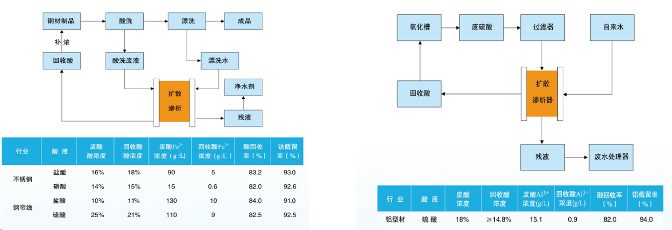 2:  比重1.3以上高濃度廢酸采用離子膜滲析法分離,殘液用特種膜分離,再蒸發(fā)濃縮回用;回收率大于85% 。